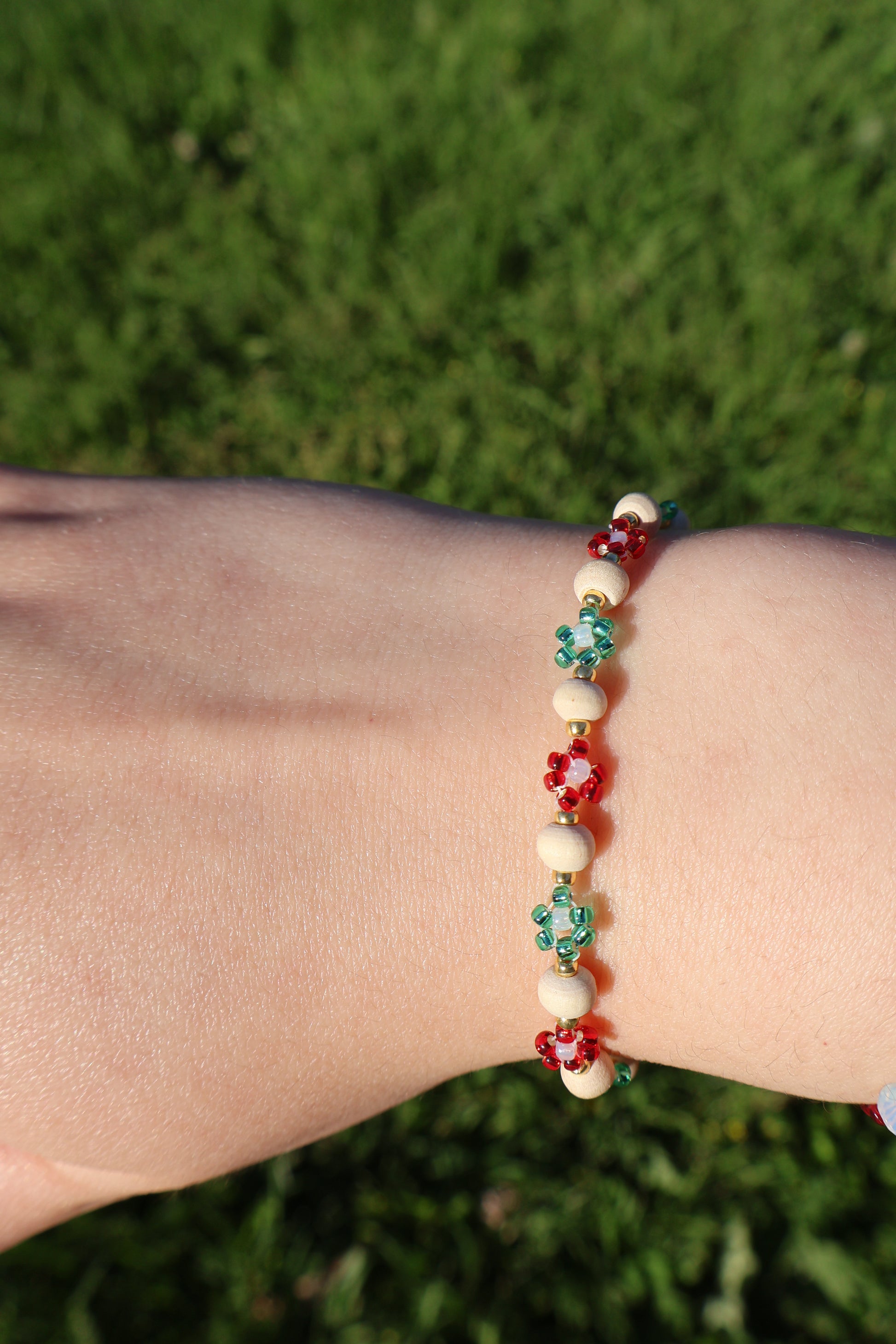 A beautifully beaded bracelet of alternating red and green flowers accented with round wooden beads. ✨