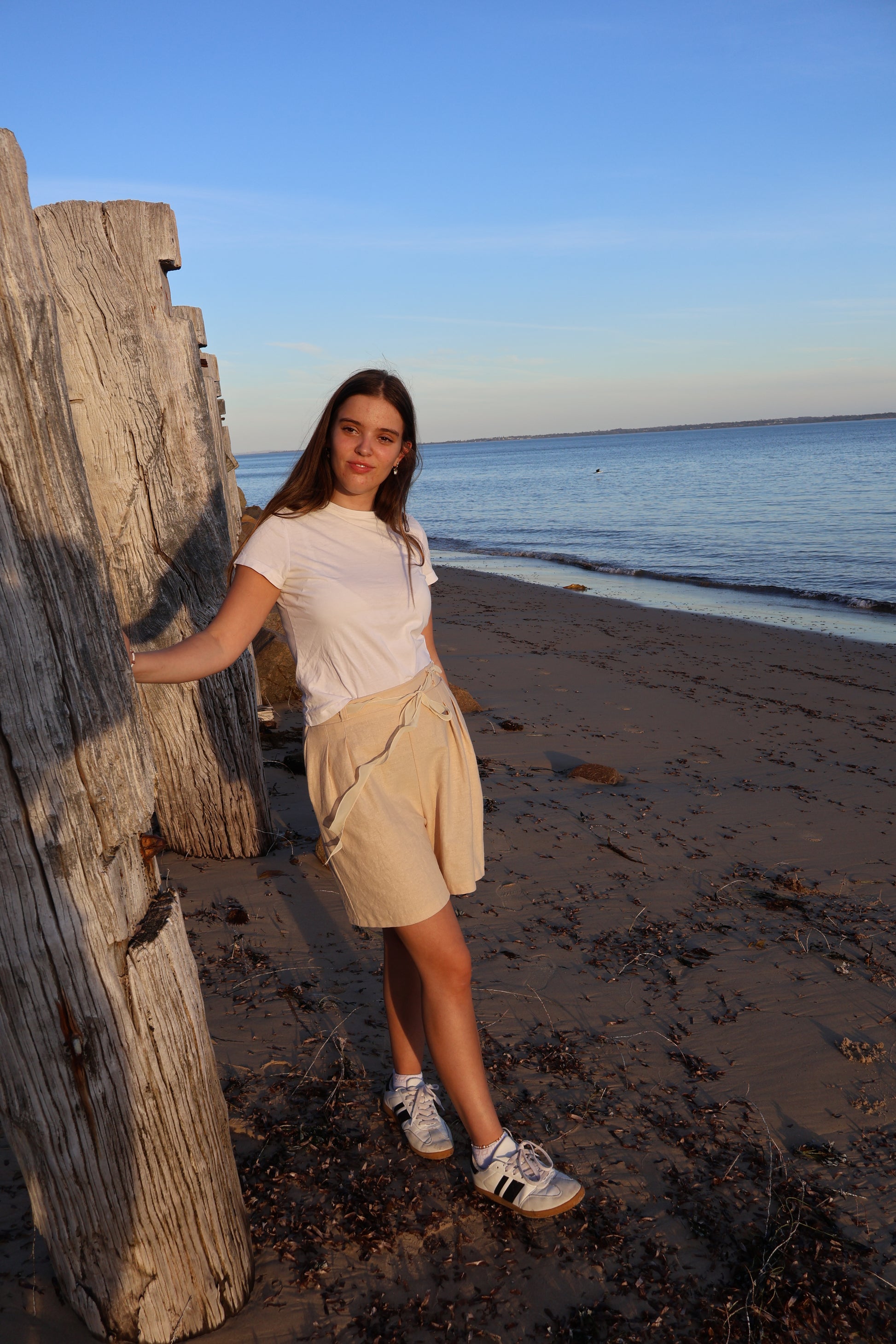Shorts that have pockets, pleats at the front, an elastic waistband at the back, and belt loops, with a curly fabric tie as a belt.