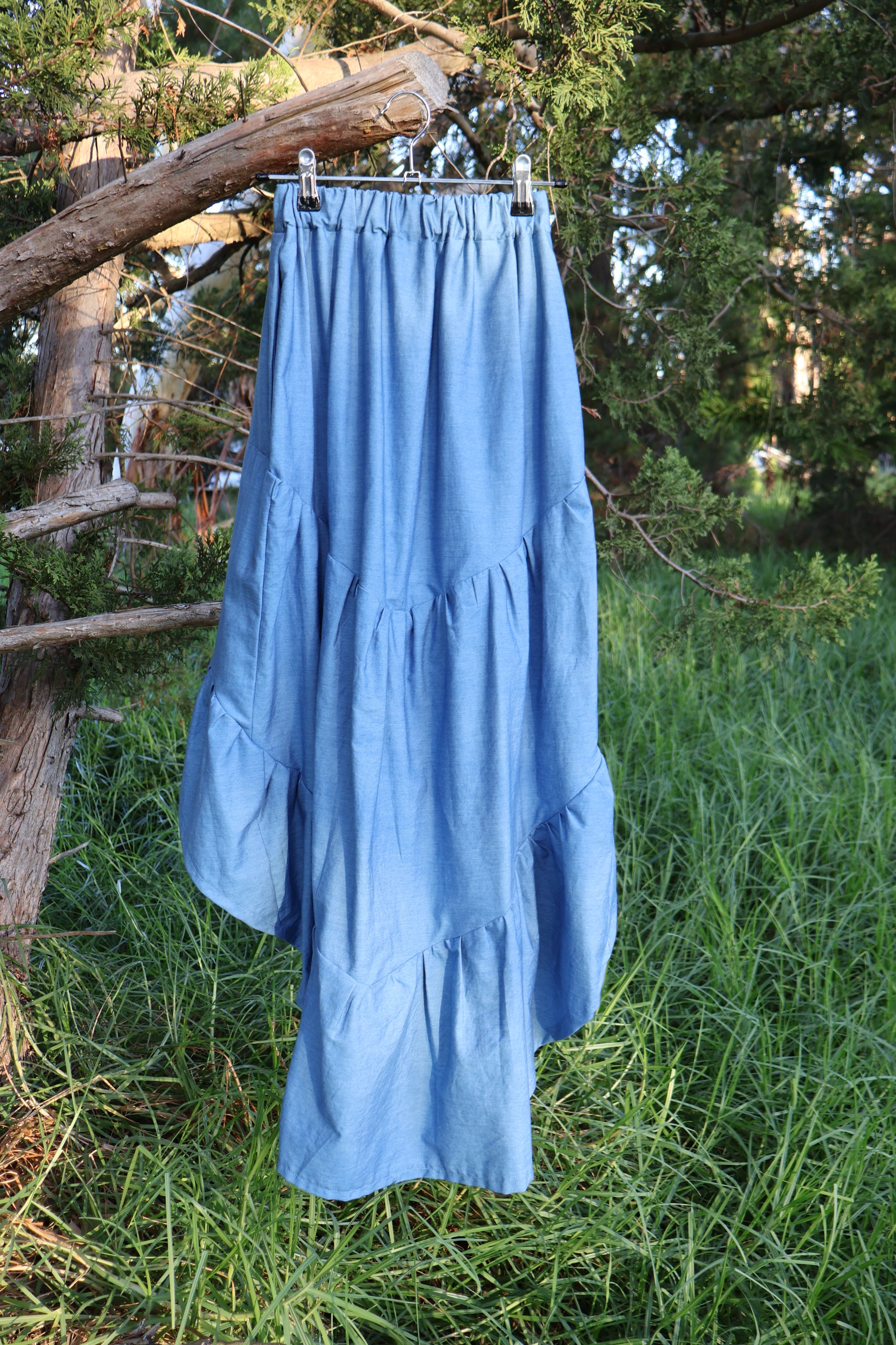A high-low skirt with gathered tiers, an elastic waistband, and pockets!