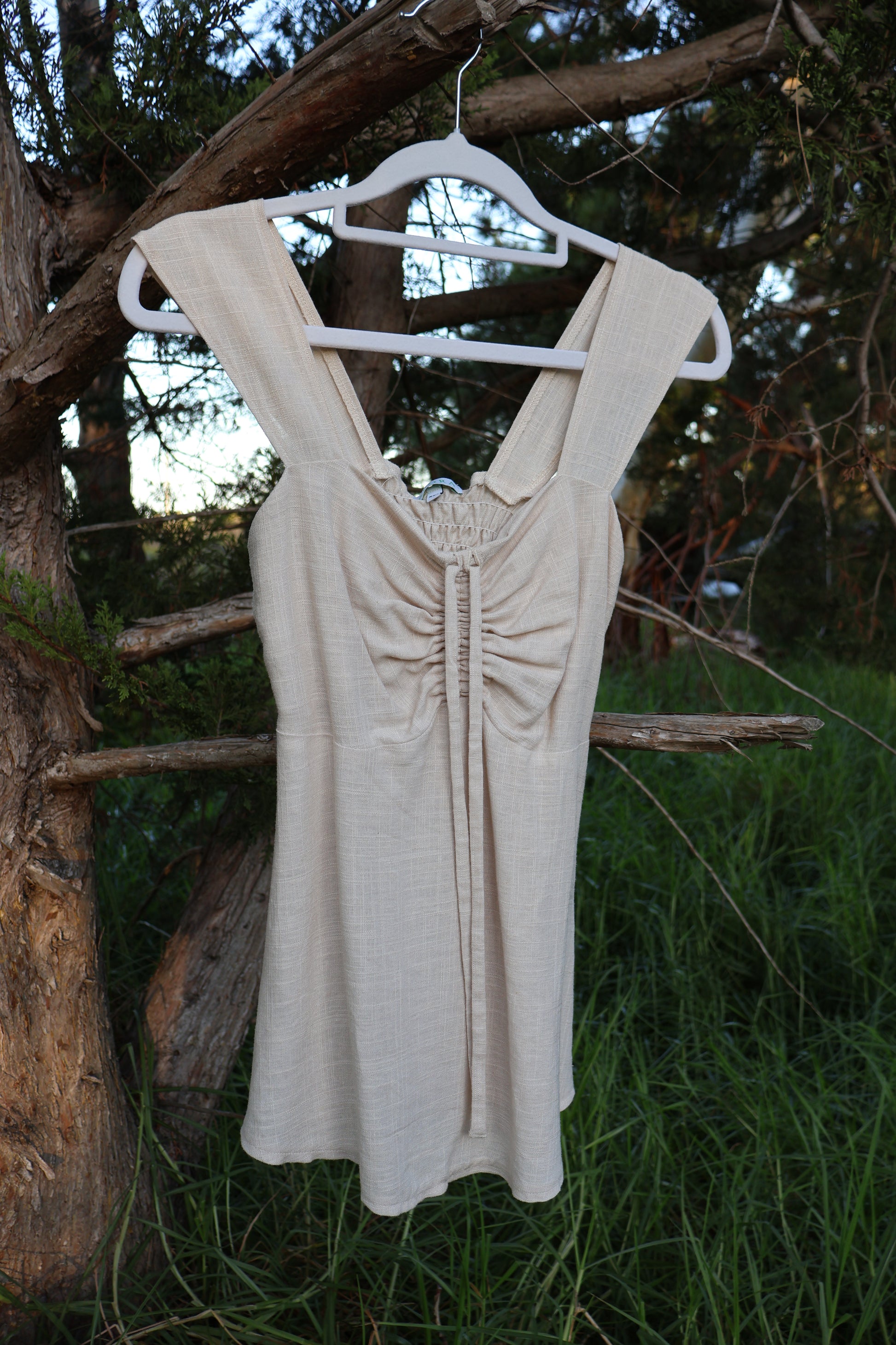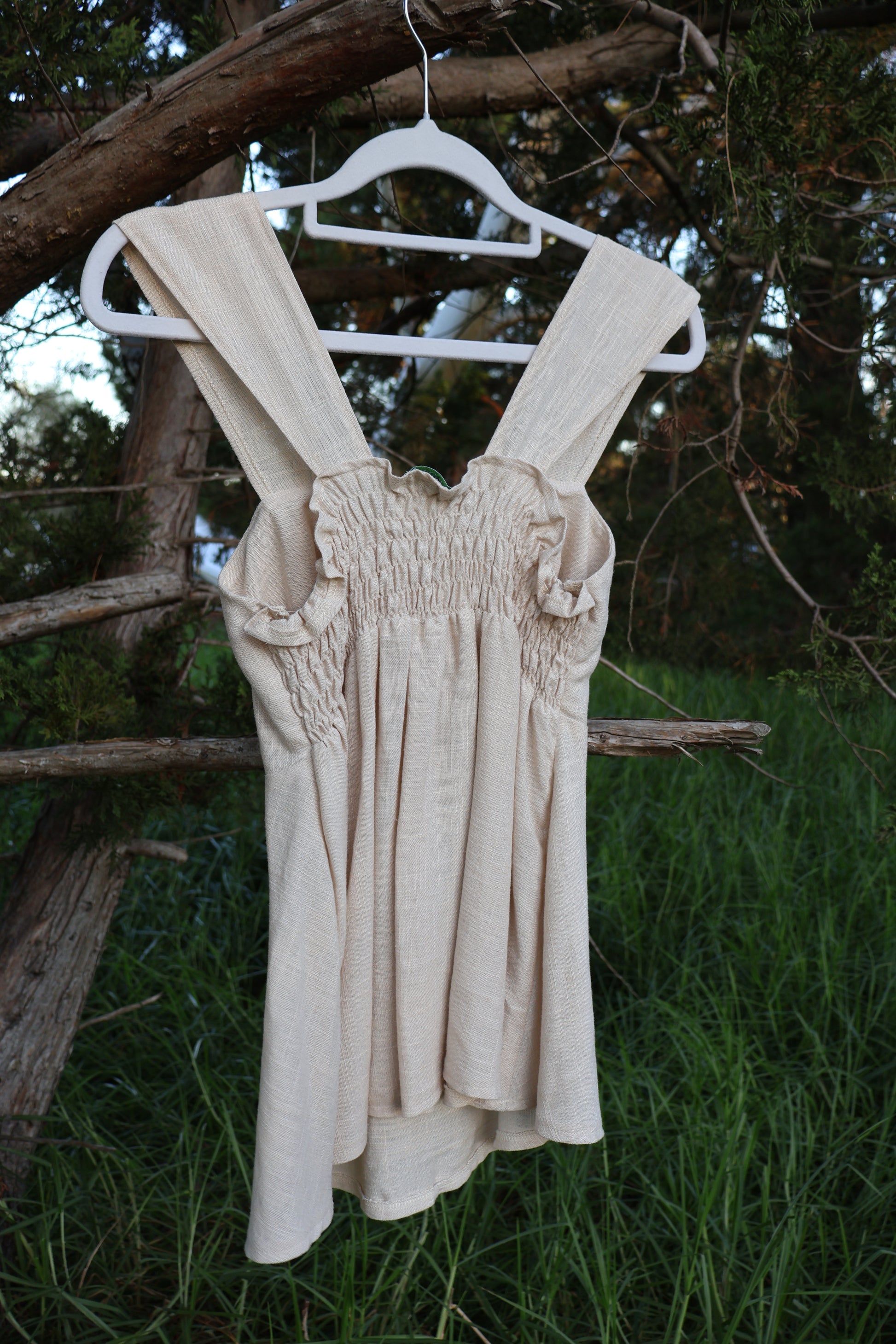 A babydoll top with an adjustable bust, and a shirred stretchy back.