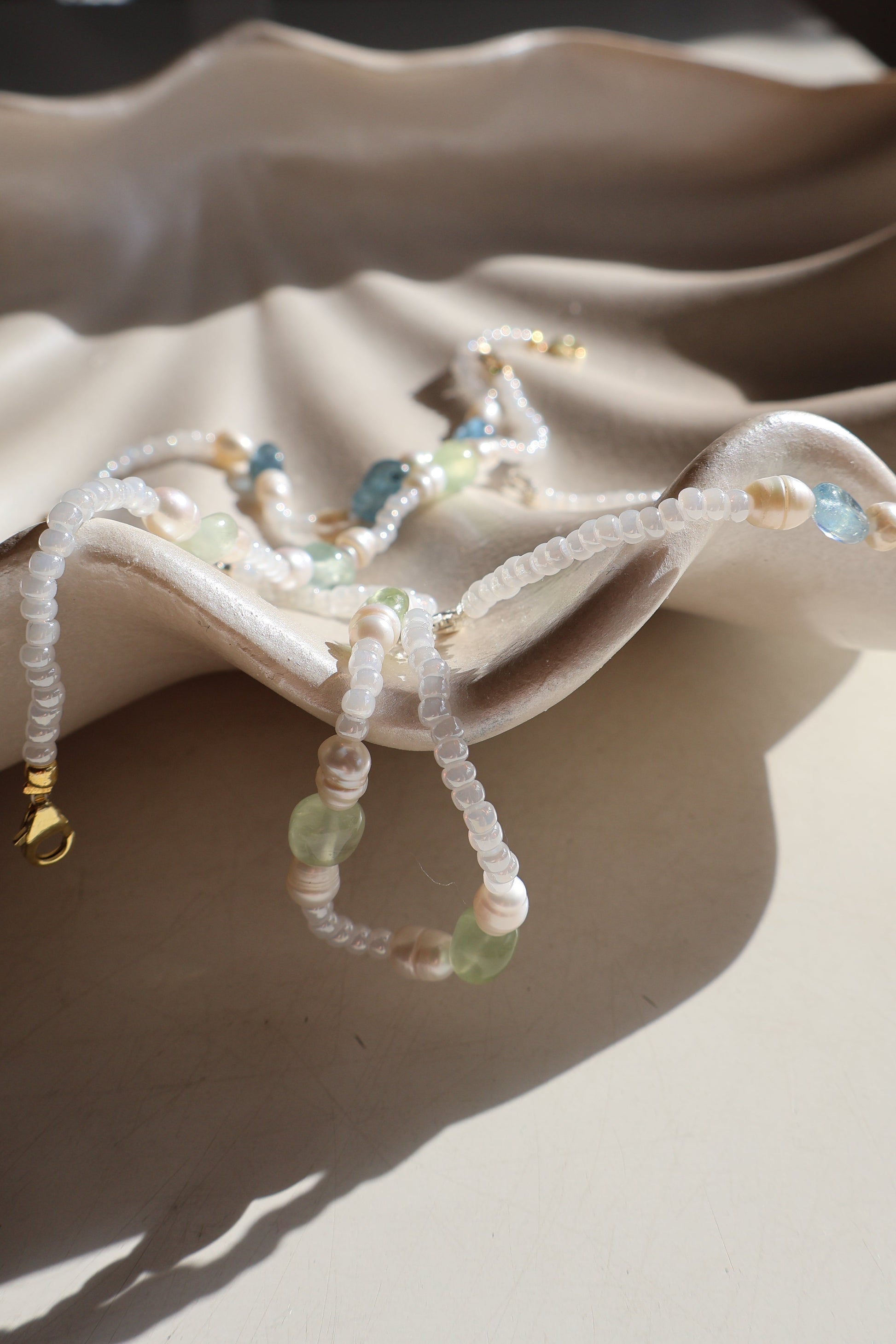 A delicate beaded bracelet adorned with blue tourmaline or prehnite, and genuine freshwater rice pearls. ✨